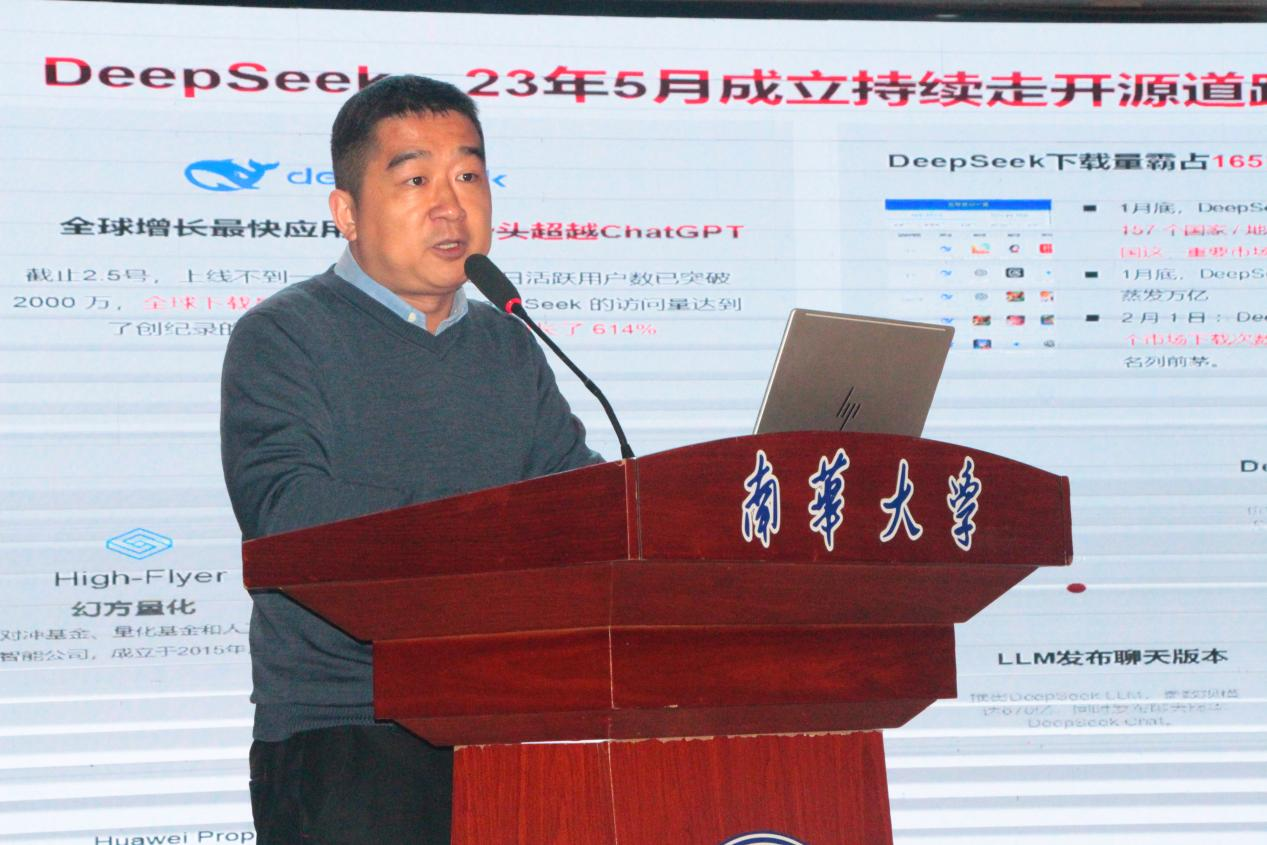 为深入贯彻2025年全国两会精神,加强人才培养模式创新,加强校企合作,3月15日晚,由南华大学计算机学院主办的“华为云DeepSeek专家校园沙龙·南华大学专场”活动在红湘校区求是园学生活动中心顺利举行。本次活动旨在分享人工智能与计算机科学的前沿技术,探讨AI在智慧校园建设中的应用,为南华学子带来了一场知识与技术的盛宴。华为湘南业务部总经理许世勇,华为资深技术架构师黄正华、南华大学计算机学院院长万亚平、党委副书记李国华、副院长欧阳纯萍、软件工程系主任田纹龙、院团委书记王祥出席活动。本次会议由田纹龙主持。