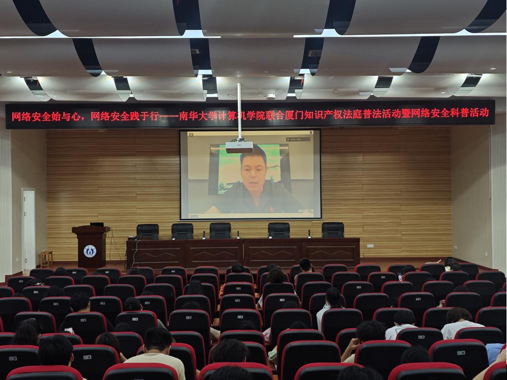 近日,南华大学计算机学院联合厦门知识产权法庭在雨母校区崇业楼学术报告厅成功举办以“网络安全始于心、网络安全践于行”为主题的普法活动暨网络安全科普活动。厦门知识产权法庭副庭长、四级高级法官叶鑫欣与一级法官詹雪霞应邀担任主讲人,各学院学生代表积极参与。活动由计算机学院老师王祥主持。