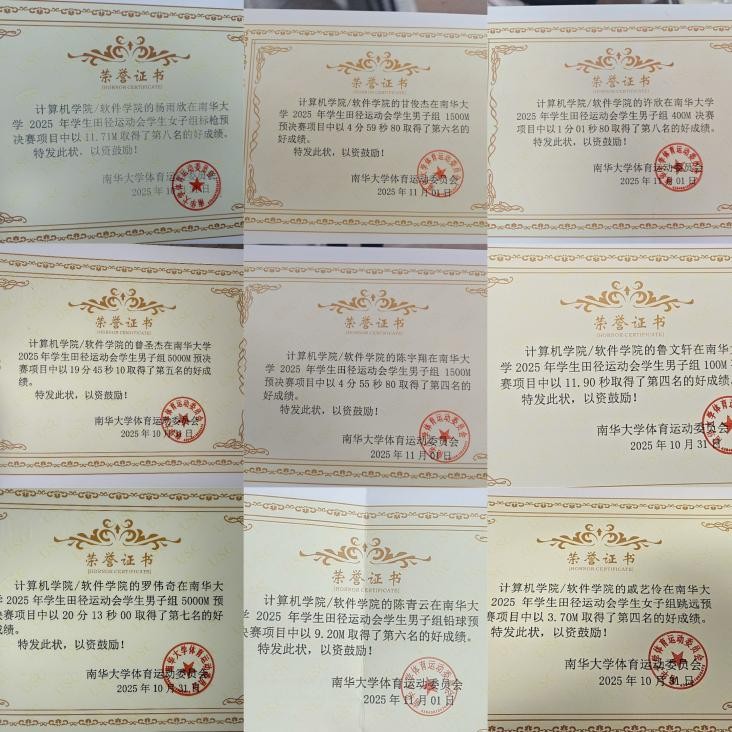 11月2日,南华大学2025年大学生田径运动会在红湘校区田径运动场圆满落幕。计算机学院学子在本次运动会中团结拼搏、表现出色,荣获“精神文明奖”“女子团体第六名”“男女团体第七名”,展现了学院全面育人工作的部分成效。