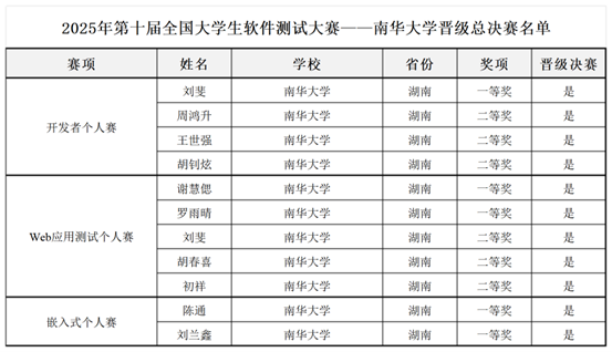 2025年第十届全国大学生软件测试大赛--南华大学晋级总决赛名单