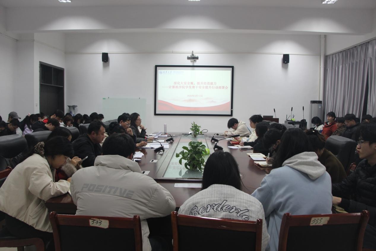 3月17日20:30,计算机学院在学院办公楼D336召开2026年春季学期“深化大安全观 提升防范能力”宿舍安全工作会议暨学生骨干安全能力提升行动部署会。院党委副书记李国华、学工室主任单云丽、全体辅导员及团学骨干参会。会议由单云丽主持。