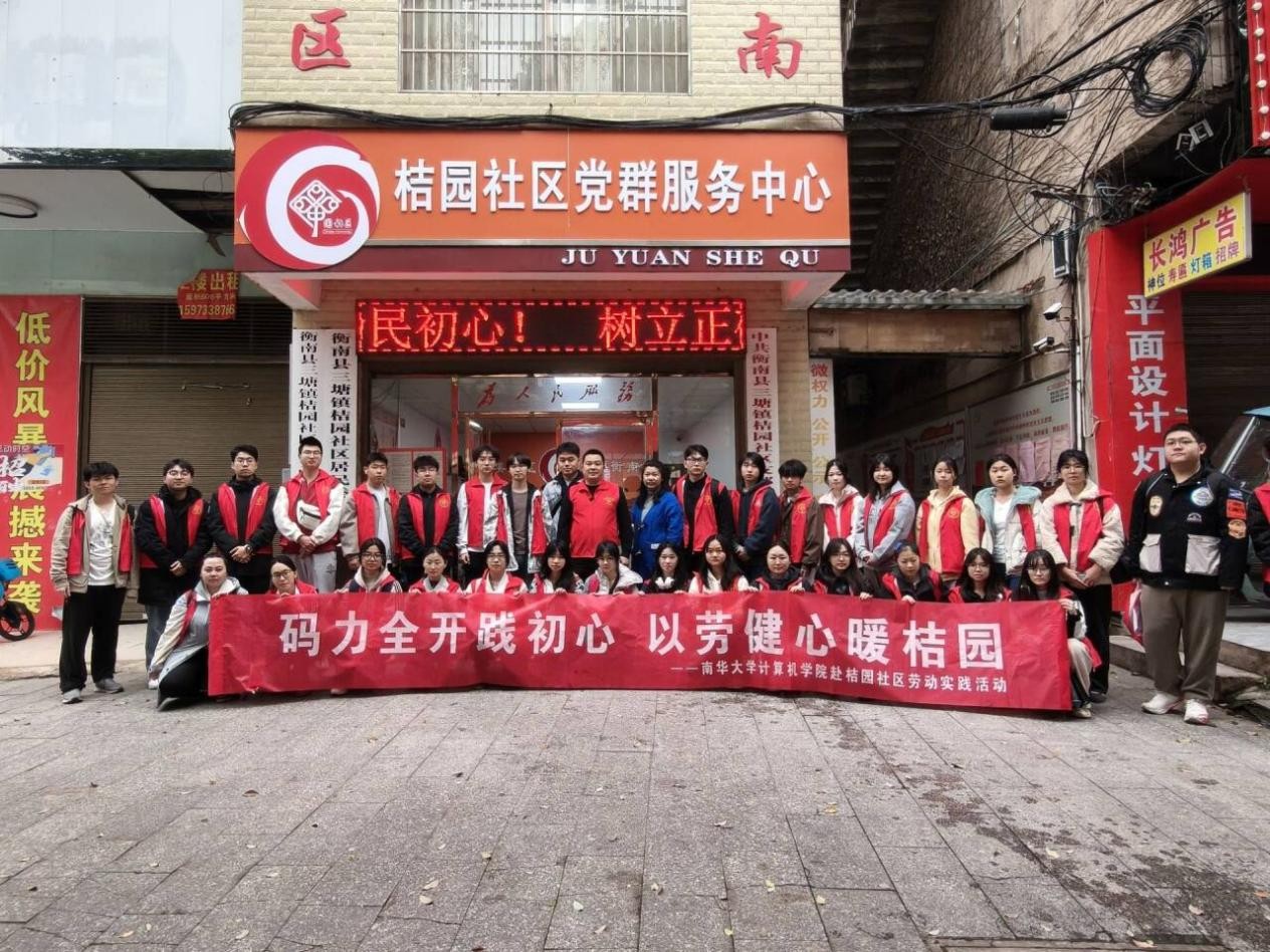 为积极开展“五育育心”活动,推动心理健康教育与劳育育人融合,3月26日,南华大学计算机学院师生赴衡阳市三塘镇桔园社区开展“码力全开践初心 以劳健心暖桔园”主题劳动实践活动。学院辅导员王祥、黄鑫楠带领38名学生代表及学生骨干与参加活动。