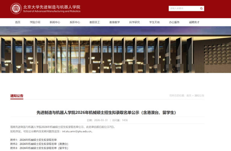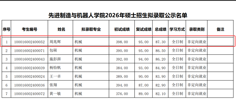 正值2026年硕士研究生招生拟录取结果陆续揭晓之时,传来喜讯,我校计算机学院本2022软卓1班周兆辉同学凭借优异表现,以初试、复试双第一的成绩,成功被北京大学工学院先进制造与机器人专业拟录取。这是学院提升人才培养质量,促进高质量就业的一重要突破。